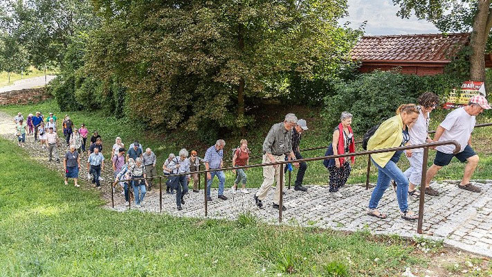 Anschließend wanderten wir über die Weichseldeiche Palschaus. Es besteht der alte Deich aus der Ordenszeit, im Rahmen der Weichselregulierung in den 1890er Jahren wurde hier ein zweiter Deich aufgebaut, um einen gleichmäßigen Abstand der Deiche zu erzielen. Bei schönem Wetter konnten wir den Blick auf die Weichsel und die Werderlandschaft genießen. Einige nutzten die Zeit, um ein Bad in der Weichsel zu nehmen.