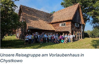 Cystkowo, ein Ort im Süden der Schwetzer Niederung in dem auch Mitglieder der Gemeinde Przechowko wohnten, war die letzte Station an diesem Tag. Nach Informationen zu dem dort befindlichen historischen Vorlaubenhauses und einer Führung durch das Haus, genossen wir die polnische Gastfreundschaft und wurden mit typisch polnischen Gerichten verwöhnt.