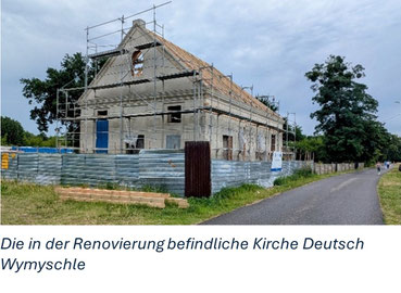 Anschließend fuhren wir in das frühere Mennonitendorf Deutsch Wymyschle und machten Halt neben der alten Mennonitenkirche. Vor drei Jahren war die Kirche eine Ruine, der Putz weitgehend abgefallen, das Dach eingestürzt, nur das Kreuz auf dem Giebel wies auf die frühere Nutzung als Bethaus hin. Nun fanden wir die Kirche von einem hohen Bauzaun umgeben, Mauerwerk und der Putz wieder hergerichtet und das Gebäude mit einem neuen Dachstuhl versehen. Das auch für das Freilichtmuseum in Wiączemin Polski zuständige Museum der Stadt Płock hat Grundstück und Kirche in Nowe Wymyśle gekauft und renoviert mit der Unterstützung Europas das Gebäude. Ein Grund mehr Deutsch Wymyschle auch für eine der weiteren Reisen als Ziel vorzusehen. Nach alten Dorfplänen und Namenslisten können die Höfe der Vorfahren aufgesucht werden und es kommt zu bewegenden Begegnungen mit den heutigen Bewohnern.