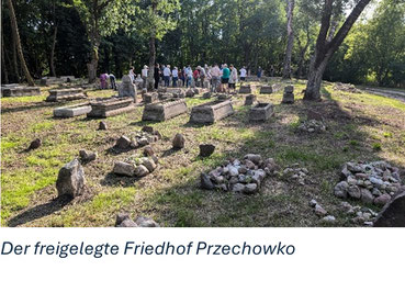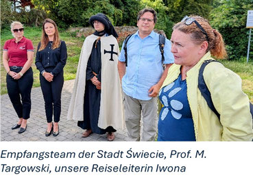 In der Nähe der Stadt Schwetz/Świecie befand sich bis in die 1830er Jahre die Mennoniten-Gemeinde Przechowko/Przechówko. Seit zwei Jahren wird der bis dahin mit Bäumen und Sträuchern überwucherte Friedhof von dem Verein Lapidaria restauriert. Man rechnete 50 Grabsteine zu finden, es wurden 135, zum Teil aus dem 18. Jahrhundert. Über die Inschriften der Grabsteine lassen sich Bezüge zum Kirchenbuch der Gemeinde herstellen. Neben Spenden aus den Niederlanden und Nordamerika unterstützt auch der Mennonitische Arbeitskreis Polen diese Arbeit. Aus diesem Grund wurde unsere Gruppe kurzfristig von der Stadt Schwetz in das historische Schloss aus der Ordenszeit eingeladen. Freundlich empfangen wurden wir von der Vize-Bürgermeisterin Marta Karolczak. Ein in Ordenstracht gekleideter Historiker erklärte uns die Geschichte des Schlosses. Danach gab es noch eine Erfrischung im Refektorium des Schlosses.