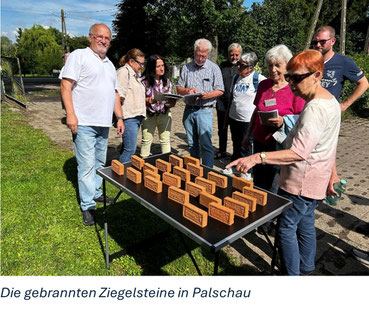 Auf dem Hof meines Urgroßvaters Eduard Harder erwartet uns eine weitere Überraschung. Eduard Harder hatte in zwei Ehen 20 Kinder. Wohl um weitere Einkünfte zu generieren, gründete er auf seinem Land eine Ziegelei, eingetragen auch auf den Messtischblättern. Frau Anna Kamieniecka, Vorsitzende des Vereins Palschau und heutige Bewohnerin auf dem ehemaligen Harder-Hof und Jozef Madej, langjähriger Freund, Seiler und wohnhaft in Kunzendorf/Kończewice, beide Künstler, hatten die Idee, Ziegelsteine mit der Inschrift Harder Ziegelei Palczewo und dem Symbol einer Windmühle, einem Wahrzeichen Palschaus herzustellen. 20 Steine, auf der Rückseite mit jeweils einem Namen der 20 Kinder gekennzeichnet, wurden auf einem Tisch präsentiert. Zwei Steine wurden mir überreicht, die anderen sollen neben der Kirche ausgestellt werden. Der jeweils erste Nachkomme eines Zweiges der Harder Familie kann sich den entsprechenden Stein mitnehmen. Natürlich sollte die jeweilige Familiengeschichte bei Frau Kamieniecka abgegeben werden.