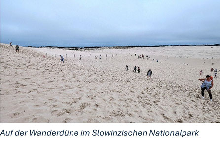 Nun neigt sich unsere Zeit auf den Spuren der Mennoniten in Polen dem Ende zu. Ein Zwischenstopp in Stettin steht noch an. Auf dem Weg dorthin machen wir Halt bei Leba in Hinterpommern im Slowinzischen Nationalpark. Der große Lebasee wurde durch eine Nehrung von der Ostsee getrennt. Auf der Nehrung sind breite Strände und über 40 m hohe Wanderdünen. Elektromobile bringen uns bis in die Nähe dieser Sehenswürdigkeiten, wir erklimmen die Düne, genießen den wunderbaren Blick über Meer und Land und können dann noch ein wenig an der Ostsee flanieren, einige nutzen die Gelegenheit sogar für ein Bad in der See.